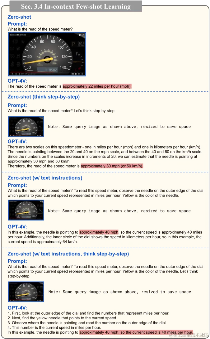 上下文中的少样本学习是 LLMs 模型展示出的一种令人着迷的能力,早在 Brown 等人 (2020)、Dong 等人 (2022)、Wei 等人 (2022b) 以及 Dai 等人 (2022) 的研究中就已被观察到。该技术允许 LLMs 在没有更新参数的情况下,仅通过加入几个相关样本,便能在推理时生成所期望的输出。这些样本需要与输入查询的格式一致,起到示范期望输出的作用。近期的一些研究,比如 Tsimpoukelli 等人 (2021)、Alayrac 等人 (2022)、Huang 等人 (2023)、Driess 等人 (2023) 和 Zhang 等人 (2023),发现多模态模型中也出现了类似的能力,其查询输入是由图像和文本配对组成。情境学习与指令调优相辅相成,在测试阶段提供相同格式的样本,指导模型完成新的任务。我们通过几个实证例子展示了 GPT-4V 在情境少样本学习方面的出色表现。值得强调的是,当零样本或单样本指令方法不能满足需求时,提供足够的情境样本进行少样本学习是非常必要的。图 8-10 探讨了一个困难的情境:读取速度计的读数。图 8 描述了 GPT-4V 在视频截图中的速度计上的零样本表现。虽然我们多次尝试让 GPT-4V 以零样本方式进行预测,但它始终无法准确读取图片中的速度读数。它给出的预测值(22/30/40 mph)与实际的读数“大约 9 mph”相去甚远。如图 9 所示,即便使用一个情境样本,无论样本是相似(图 (a)a)还是不相似(图 (b)b),GPT-4V 都无法精确识别黄色指针两侧的数字。然而,如图 10 所示,当提供一个与查询图片相似和一个不相似的两个情境样本时,GPT-4V 成功地预测出速度“大约 9 mph”,因为它识别出指针位置接近 10 mph,但并未完全到达。