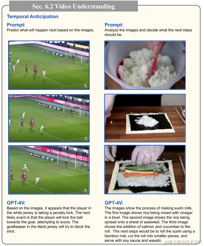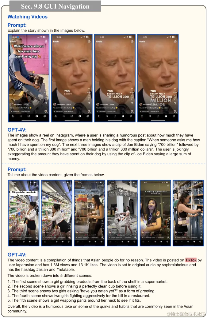 视频是网络浏览旁的另一大在线信息来源。GPT-4V 已展示了根据热门短视频截图来描述视频内容的能力。无论视频是否叠加字幕(图 115 和 116),或者没有字幕(图 117,118,119),GPT-4V 都能提供关于视频内容的深刻理解,显示出其在用户上传视频内容自动转录方面的潜力。