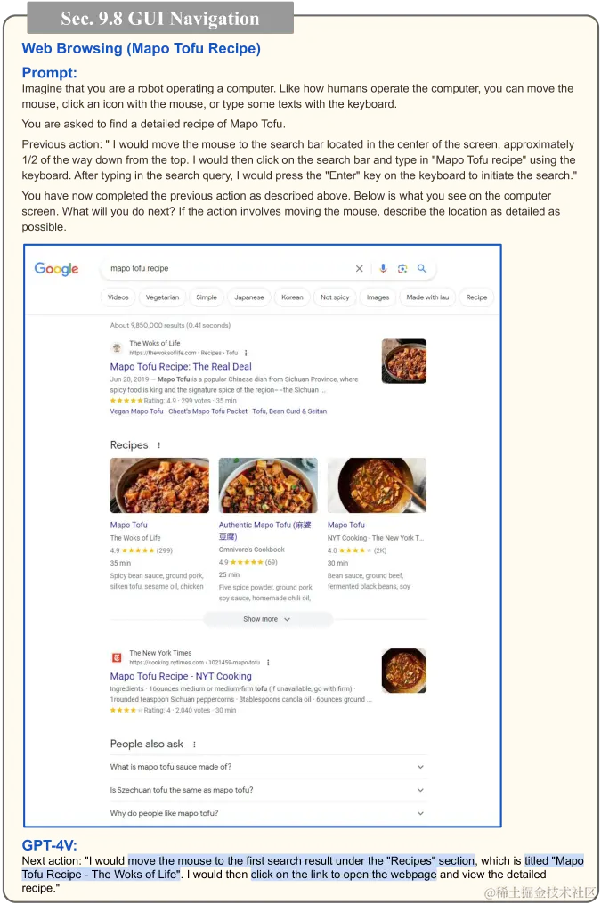 图 94:GPT-4V 通过 GUI 在网络上搜索麻婆豆腐的食谱,蓝色部分标出了预期的操作动作。有关详细讨论,请参见第 9.8 节。