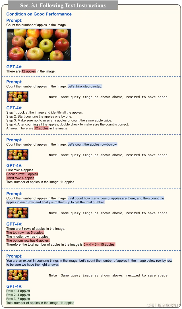 据观察,LLM 并非总是致力于成功完成任务(Andrej,2023)。实际上,它们倾向于模拟各种表现的训练数据集。用户若希望模型成功执行任务,则需明确提出要求,此举对提升 LLM 的性能非常有效(Zhou 等,2022)。在 LMM 方面,我们有类似发现。如图 4 所示,我们比较了模型对不同计数文本指令的响应。首先,我们提出一个简单明了的指令:“数一下图片中有多少苹果。”然而,GPT-4V 错误地计算出图片中共有 12 个苹果。为优化表现,我们尝试加入“让我们一步一步思考”的表达,使用了 Kojima 等(2022)为 LLM 提出的零射程思考链策略。尽管 GPT-4V 正确预测了步骤,但这对最终的计数没有帮助,得出的答案“12 个苹果”仍是错误的。随后,我们更改指令为“按行数苹果”,这更符合图像的实际内容。虽然 GPT-4V 给出了正确的总数,但在数第二/三行苹果时出错。当我们进一步细化指令为“先数苹果的行数,再数每行的苹果数,最后加总”时,最终得数与正确答案(15 vs 11)相差更大。最终,参照 Zhou 等(2022)为 LLM 设计的指令“让我们逐步解决,确保答案准确”,我们设计了类似指令:“你是计数专家。让我们逐行数图中的苹果,确保得到准确答案。”通过这样的指导,GPT-4V 不仅准确数出每行的苹果数,还正确给出了总数。本文中,我们多次利用这一策略,以期在不同场景下都能取得更好的效果。