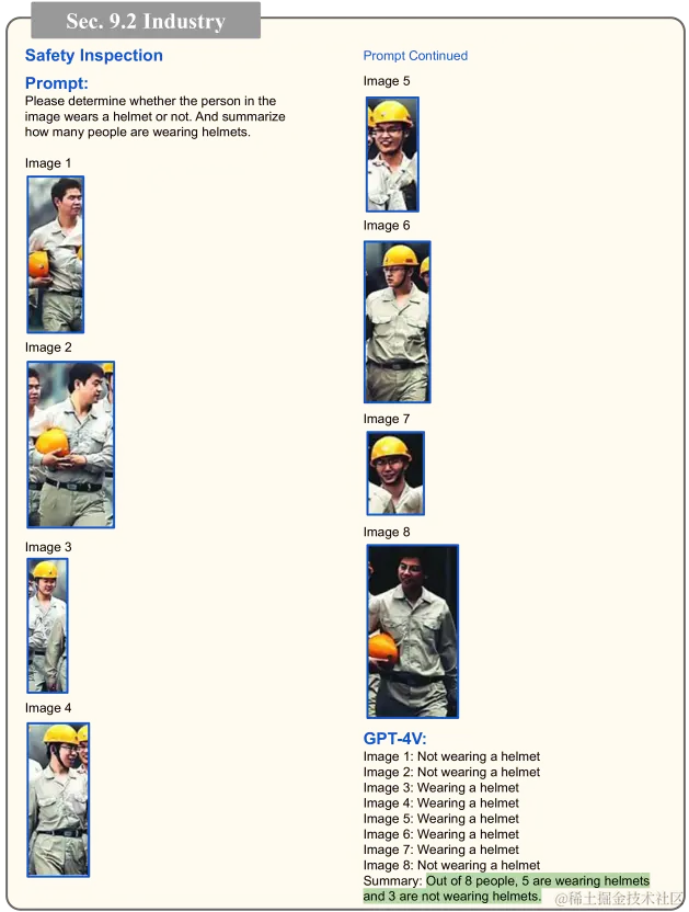 图 121 展示了 GPT-4V 如何扩展以支持与 ReAct (参见 Yao 等人 [2022] 和 Yang 等人 [2023a])的多模态链。通过这一扩展,链中的插件能提供多模态信息,进而被 GPT-4V 集中处理,以在如 PPE 计数这样的场景中进行高级推理。如图 121 所示,整个串联过程分为两轮,包括思考、行动和观察,每一轮都激活了特定的插件。在第一轮,GPT-4V 判断需要进行人员检测以统计佩戴头盔的人数(思考 1),于是调用人员检测工具(行动 1),并得到图片中每个检测到的人的边界框坐标(观察 1)。进入第二轮,根据得到的边界框信息,GPT-4V 推断出图片中总共有 8 个人(思考 2)。然后,它使用图像裁剪工具,根据每个人的边界框坐标裁剪出各自的图片(行动 2)。结果输出(观察 2)包含 8 张编号的图片,从图片 1 到图片 8。最终,GPT-4V 分析每个人是否佩戴头盔,并总结出佩戴头盔的人数。