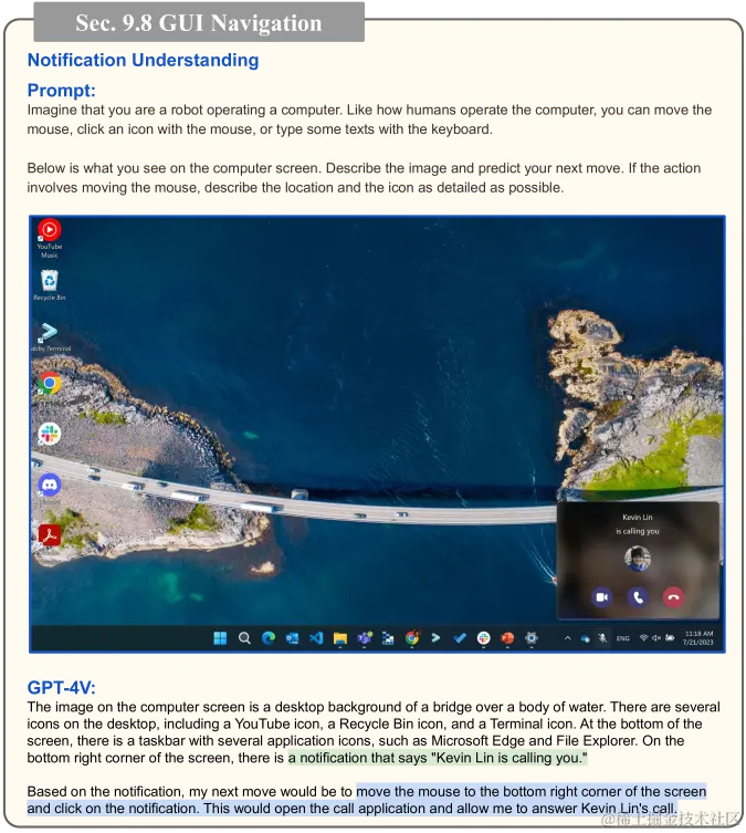 通知在现代的人机交互中起着核心作用。GPT-4V 已证明了它能理解通知的内容并作出合适的反应。如图 112 所示,该模型能读取并响应通知,比如对于在西雅图的会议提议,它会建议用户打开 Maps 应用。此外,它还能有效地处理电脑屏幕上的来电(图 113)和信息(图 114)通知。