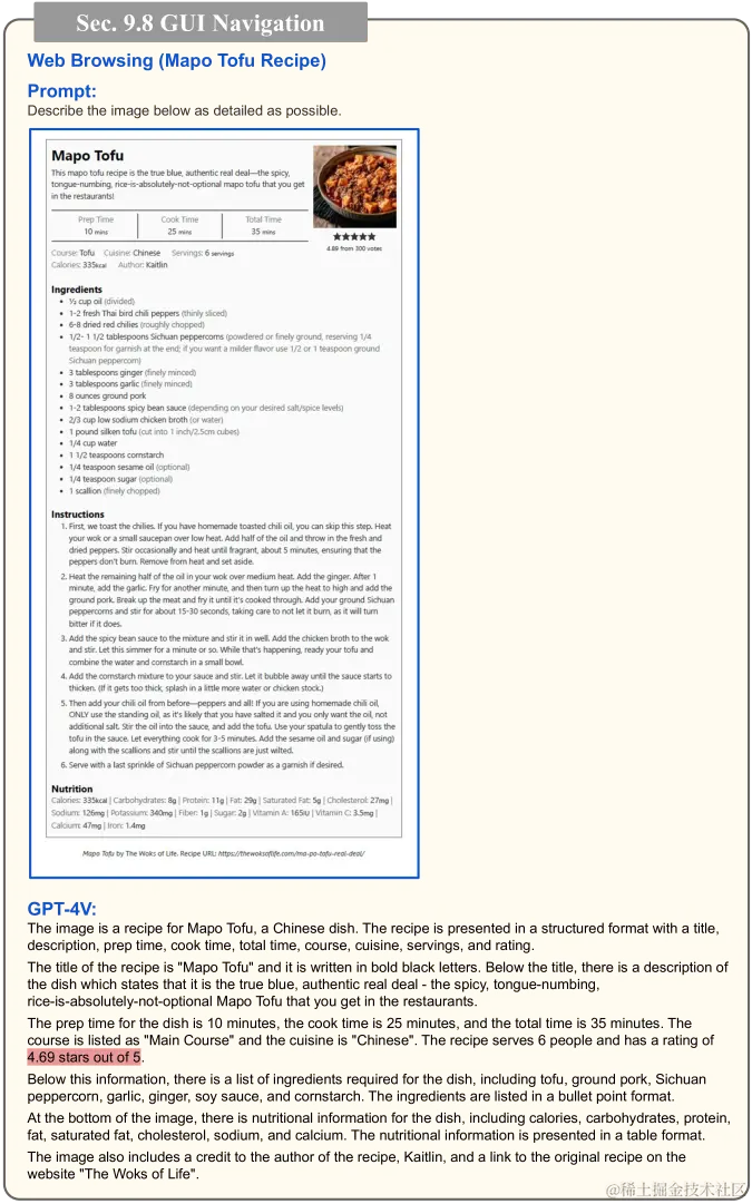 图 96:GPT-4V 通过 GUI 操作,在网络上搜索麻婆豆腐的食谱。在预测将食谱打印出来后,我们要求 GPT-4V 阅读食谱截图,并进行概括。红色高亮部分标出了对图像描述的不准确之处。更多详细讨论见第 9.8 节。