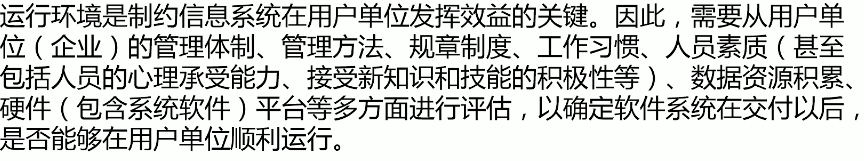 - 技术能力的可能性:相关技术的发展趋势和当前所掌握的技术是否支持该项目的开发,市场上是否存在支持该技术的开发环境、平台和工具