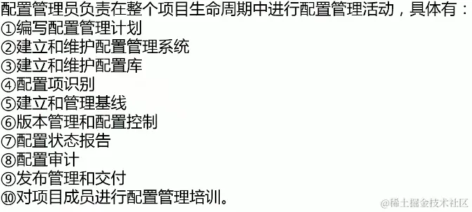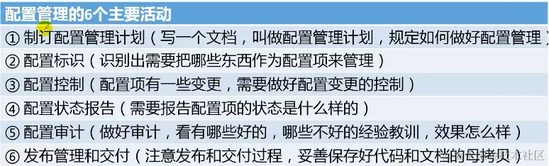 配置管理计划的主要内容为: ①配置管理活动,覆盖的主要活动包括配置标识、配置控制、配置状态报告、配置审计、发布管理与交付。 ②实施这些活动的规范和流程。 ③实施这些活动的进度安排。 ④负责实施这些活动的人员或组织,以及他们和其他组织的关系。