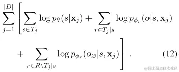 这里,我认为作者在将整个式子就是将获得注释句子中正确的三元组的概率,打碎,成为了