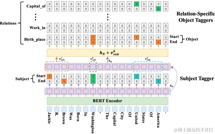 - 由改进为的关系特定标记器(主语宾语的函数),先识别可能的主语,然后对于每个主语,使用该关系的标记器来同时识别可能的关系和对应的宾语