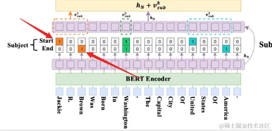 根据起始和结束位置标记器的结果来确定任意目标的跨度。第一个开始令牌Jackie,最近的结束令牌Brown,得出第一个主题跨度的检测结果是Jackie R.Brown。由此可以保证任何实体跨度的完整性。(匹配结束令牌时,不会考虑开始令牌前面的令牌)