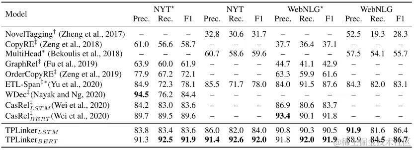 - WebNLG* 的性能已经饱和,因为提取含有171个预定义关系的三元组非常困难,尤其是训练数据很少(5019句)。 这些方法获得了90+F1的分数,可能已经超过了人类水平的表现。 换言之,提振空间太有限。
