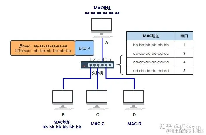 到达交换机时,交换机内部通过自己维护的 MAC 地址表,发现目标机器 B 的 MAC 地址 bb-bb-bb-bb-bb-bb 映射到了端口 1 上,于是把数据从 1 号端口发给了 B,完事~