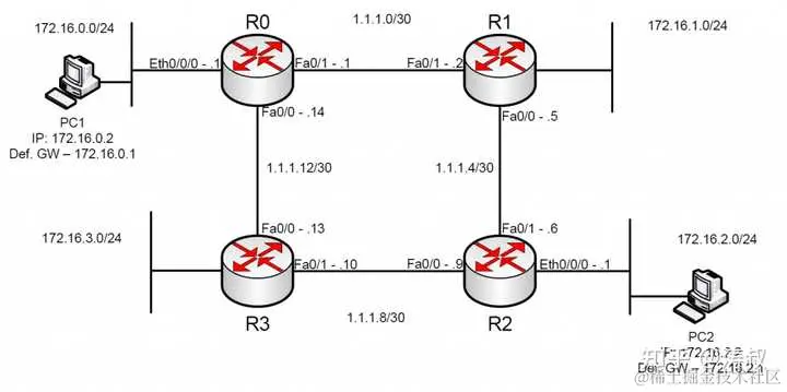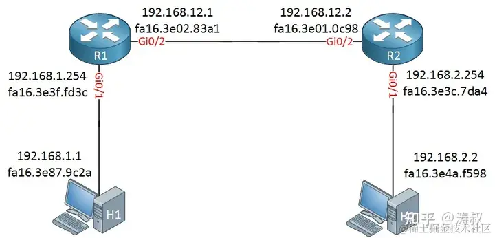 以上图为例,假如H1想给H2发数据。H1知道H2跟自己不在一个网络,所以它通过ARP查到R1的 Gi0/1 网卡的 MAC 地址,给 fa16.ee3f.fd3c 这个 mac 地址发送了一个 IP 报文,这个报文的目标IP是H2的IP地址,也就是 192.168.2.2,原IP地址是H1的IP,也就是192.168.1.1。 R1收到这个报文后发现目标地址是192.168.2.2,需要通过 Gi0/2 网卡转发给路由器 R2(因为R1保存了 H2 所在网络的前缀)。R2 会重复同样的过程,最终IP报文被转发给H2。