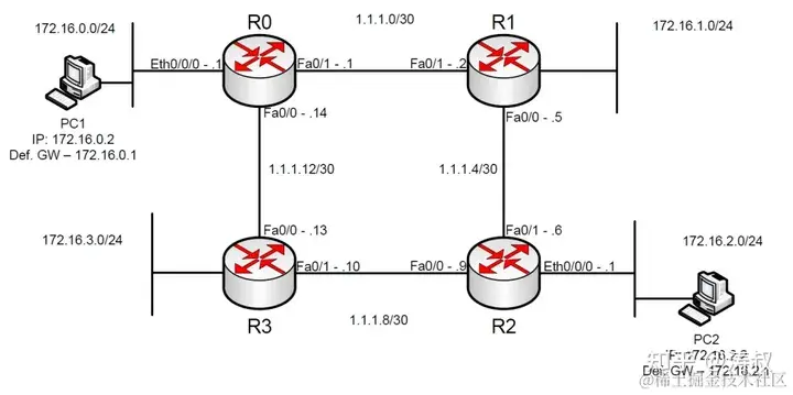 我们先给上面的组网方式中的每一台设备,加上自己的 IP 地址
