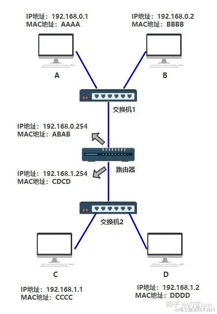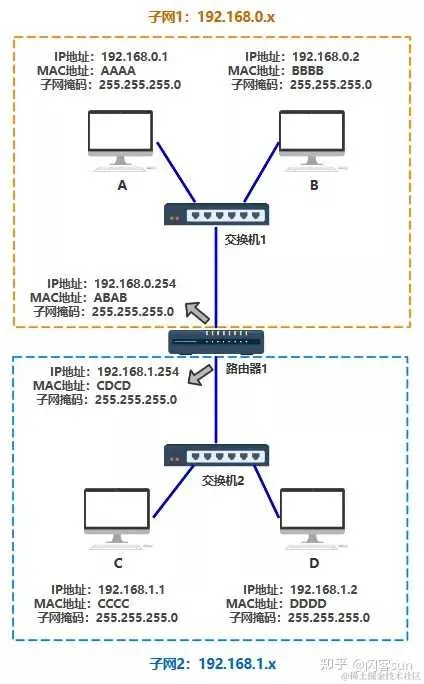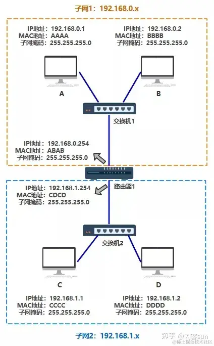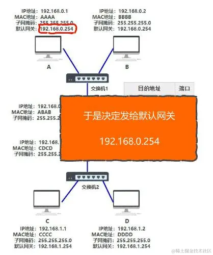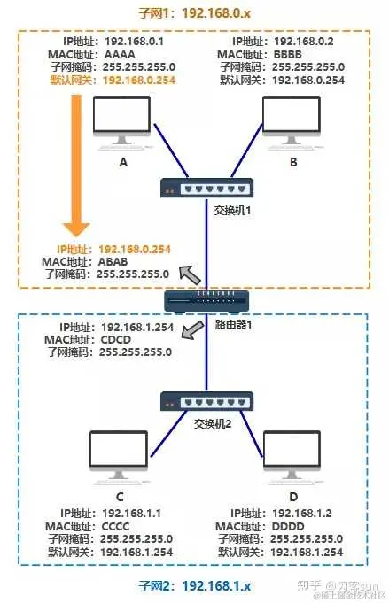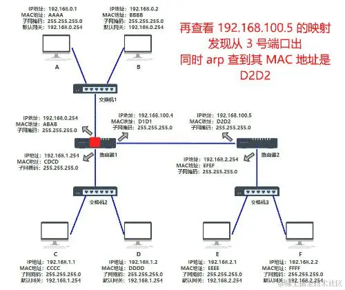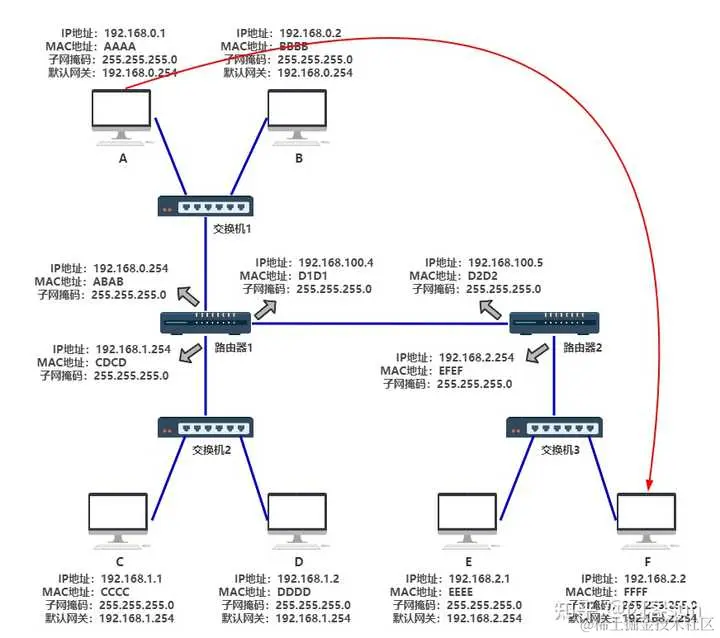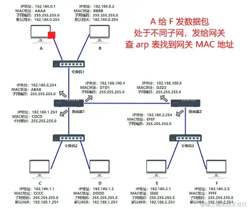 1. 首先 A(192.168.0.1)通过子网掩码(255.255.255.0)计算出自己与 F(192.168.2.2)并不在同一个子网内,于是决定发送给默认网关(192.168.0.254)