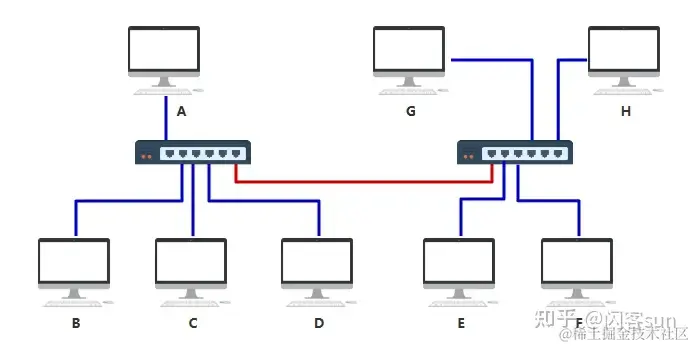 你完全不需要设计额外的东西,只需要按照之前的设计和规矩来,按照上述的接线方式即可完成所有电脑的互联,所以交换机设计的这种规则,真的很巧妙。你想想看为什么(比如 A 要发数据给 F)。