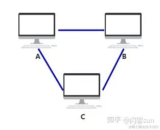 有一天,一个新伙伴 C 加入了,但聪明的你们很快发现,可以每个人开两个网口,用一共三根网线,彼此相连。
