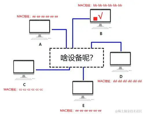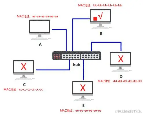 由于转发到了所有出口,那 BCDE 四台机器怎么知道数据包是不是发给自己的呢?