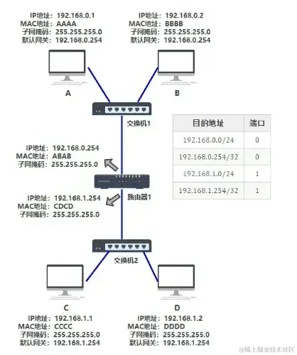 这时路由器 1 连接了路由器 2,所以其路由表有了下一条地址这一个概念,所以它的路由表就变成了这个样子。如果匹配到了有下一跳地址的一项,则需要再次匹配,找到其端口,并找到下一跳 IP 的 MAC 地址。