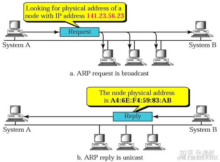 每当电脑在通信之前会先在网络上发一个广播(这个广播不会被转发到其他网络),问谁的IP地址是某某某。这个时候对应的电脑就会回包说是我,我的MAC地址是某某某。发送方就拿到了接收方的MAC地址,进而完成通信。