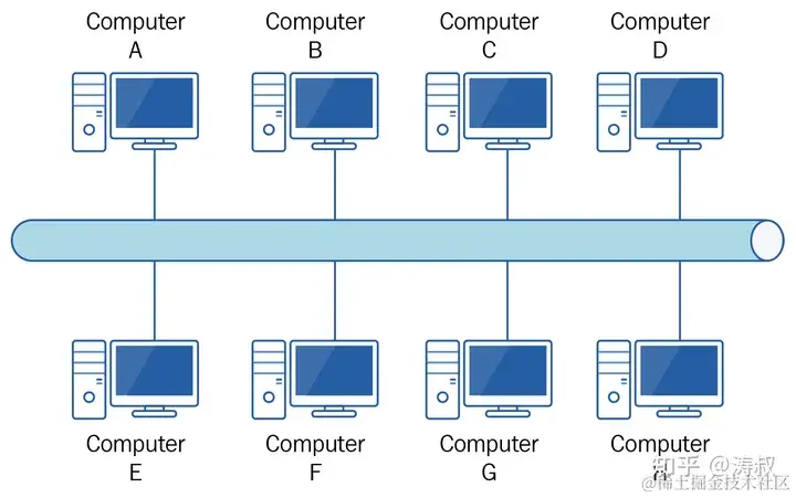 为了降低成本,人们想了另外一种连接方式,总线网线。