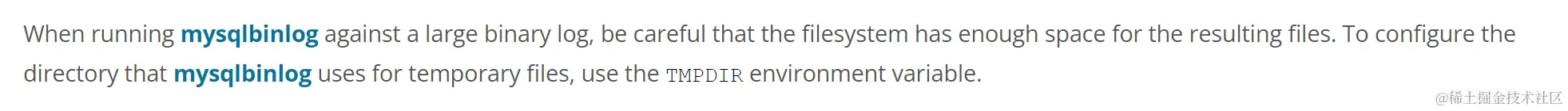 When running mysqlbinlog against a large binary log, be careful that the filesystem has enough space for the resulting files. To configure the directory that mysqlbinlog uses for temporary files, use the TMPDIR environment variable.