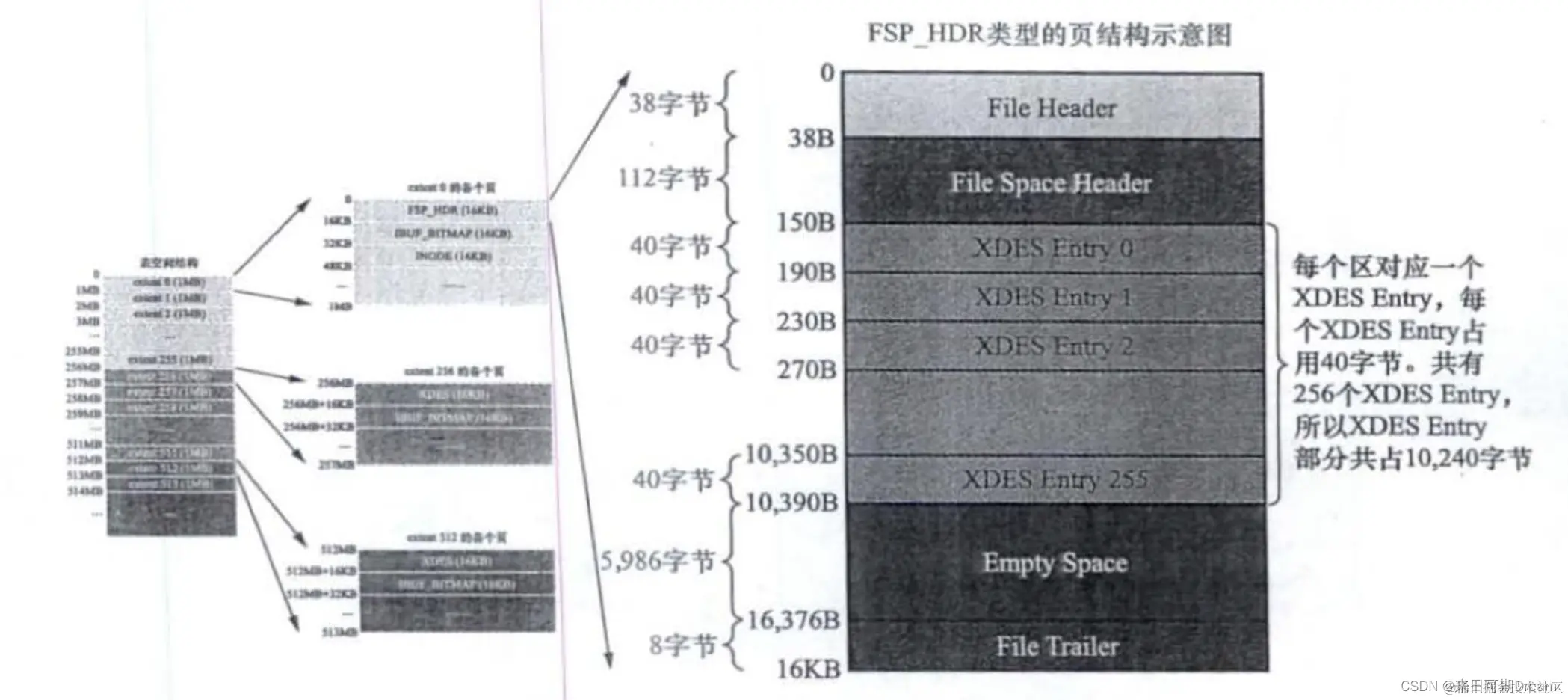 - FSP_HDR记录表空间整体属性以及所有区的属性,整个表空间只有过一个FSP_HDR类型页面