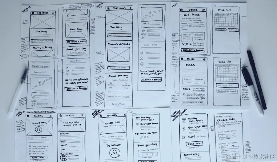 - 手绘原型:使用纸笔、白板绘制而成,是原型图最早的形式,并且在现在仍然有适用场景。这也是保真度最低的一类原型图,虽稍显简陋,但其绘制起来简单高效,适合用在产品构思初期。