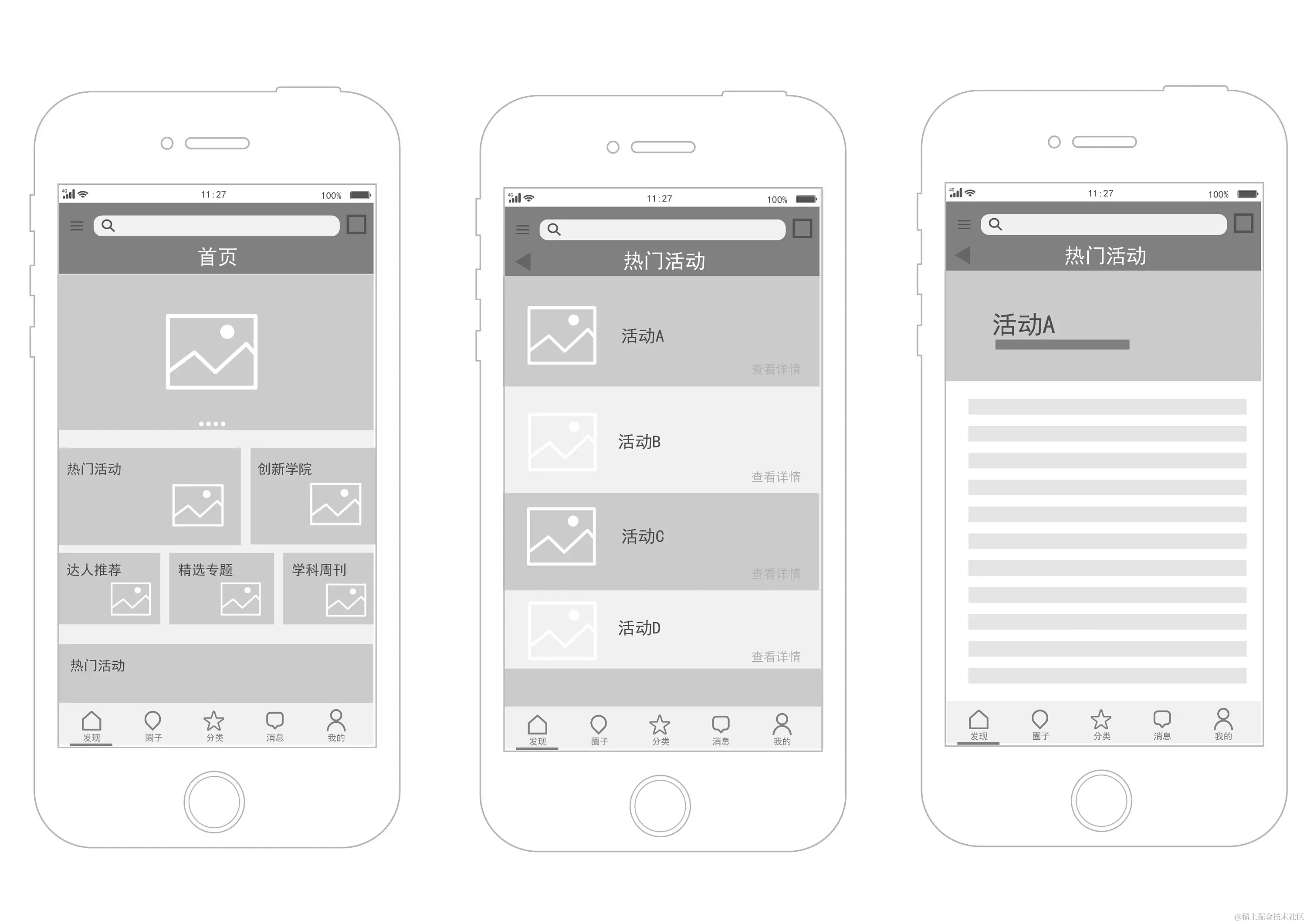 - 中低保真原型:通常使用简单的元素来搭建项目界面,界面多为灰度风格,图片、界面也可以采用占位符、骨架屏等进行填充。对于这一类原型图,虽不用追求过多的视觉效果,但也需要注意界面布局的基础规范,尽量让界面更加整洁。
