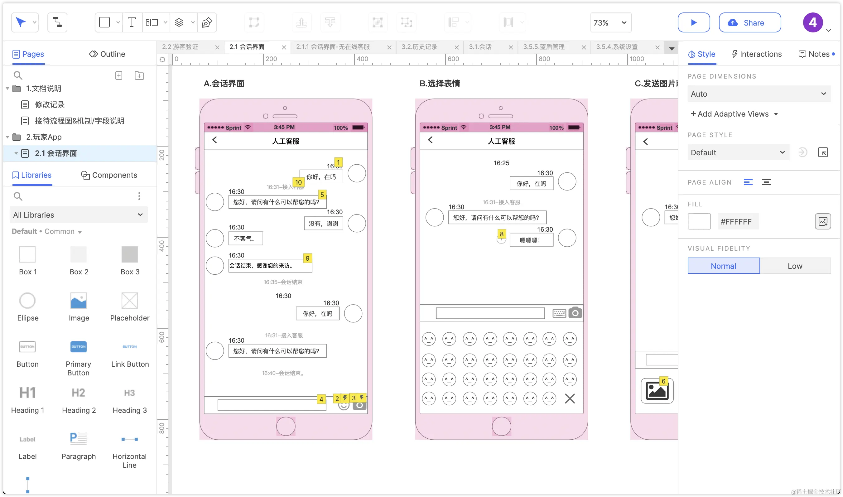 第一类是页面交互,即项目中让各个页面之间能够进行流转,如点击按钮进行翻页。此类交互只需要建立页面中的元素与各个页面之间的交互关联即可轻松制作。