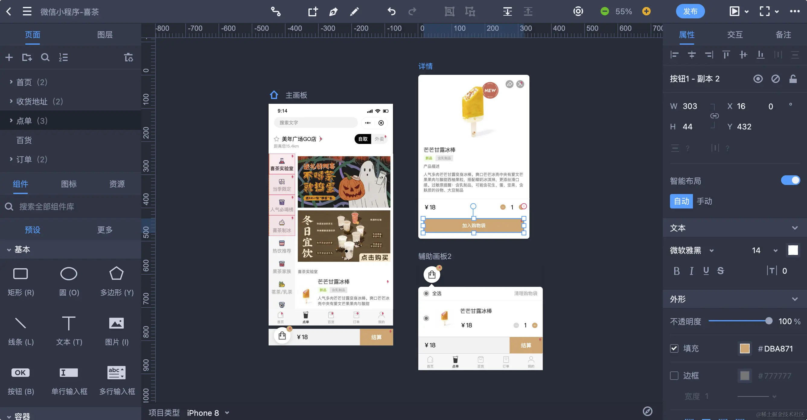 非常具有代表性的小程序项目,其中包含了丰富的小程序常用组件,并且包含首页、商品展示、点单、订单相关页面。项目的保真度高,可以直接保存进行复用,适合需要制作App及小程序项目的小伙伴。
