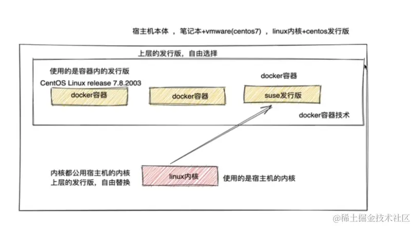 对进程进行封装隔离,属于操作系统层面的虚拟化技术。使用宿主主机的内核(linux内核),自由替换内核上层的发型版本(CentOS,Ubuntu)。
