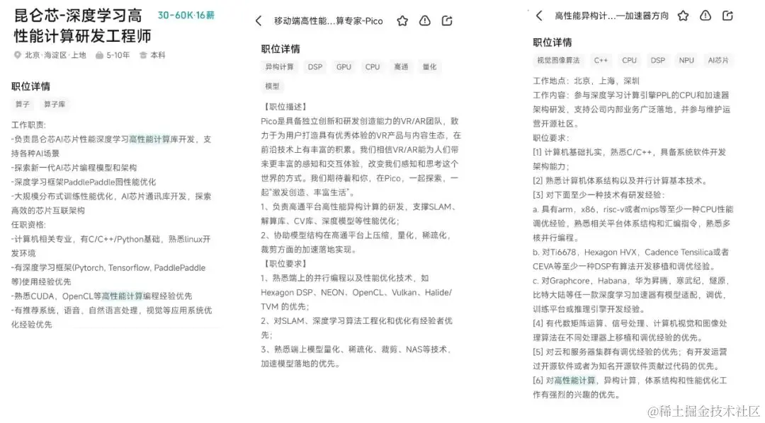 目前很多 AI 公司或者从事 AI 的部门招聘都有这个岗位需求,我从某聘上截取了几个有代表性的公司的招聘信息,分别是某度、某跳动和某汤,大家可以感受一下。