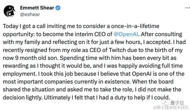 最后,Emmett Shear也最新发了一篇很长的推文,文中写道: 自己也是今天才接到董事会的邀请电话,在与家人商量并思考了几个小时后答应了。