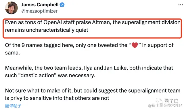 然而,值得注意的是,在这个事情中, OpenAI超级对齐部门成员基本都在这次比心支持活动中保持了沉默 。