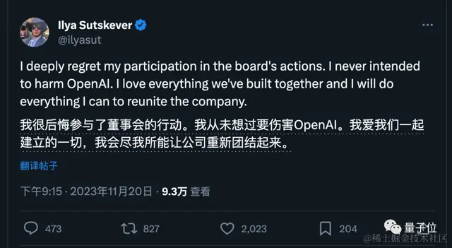 “我很后悔。我从没想过要伤害OpenAI。我将尽我所能让公司重新团结起来。”