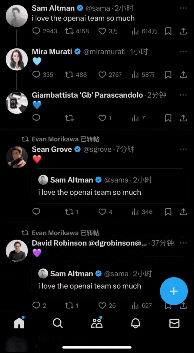 昨天中午左右,在曝出董事会要重新谈判的消息不久之后,奥特曼发布了一条 “i love the openai team so much”的“神秘推特” ——