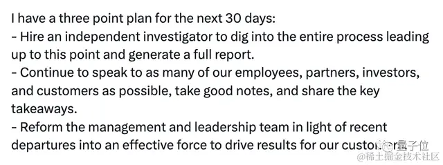 值得一提的是,尽管“临危受命”,Emmett Shear已经为未来30天制定了一个三点计划,其中包括: