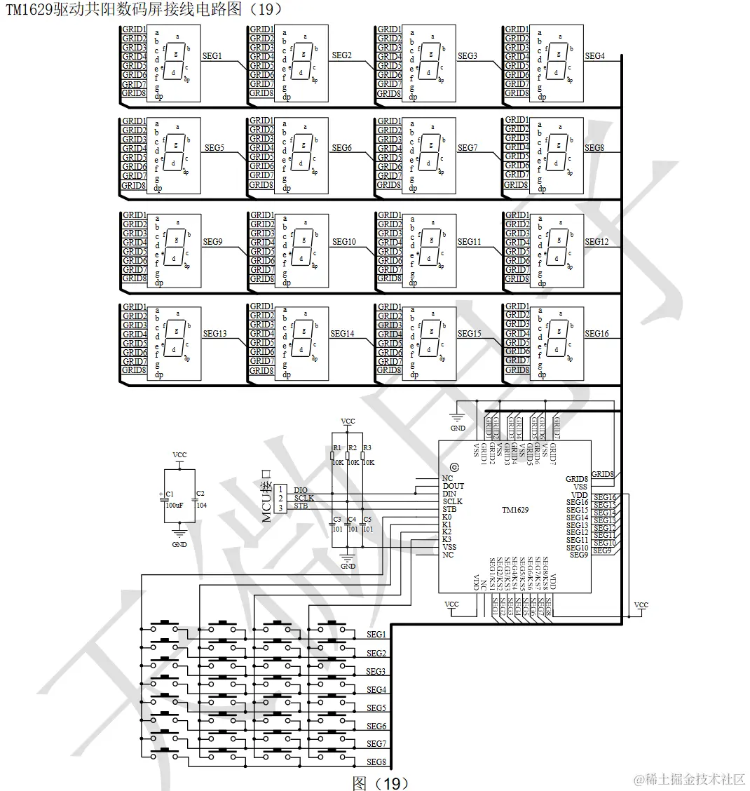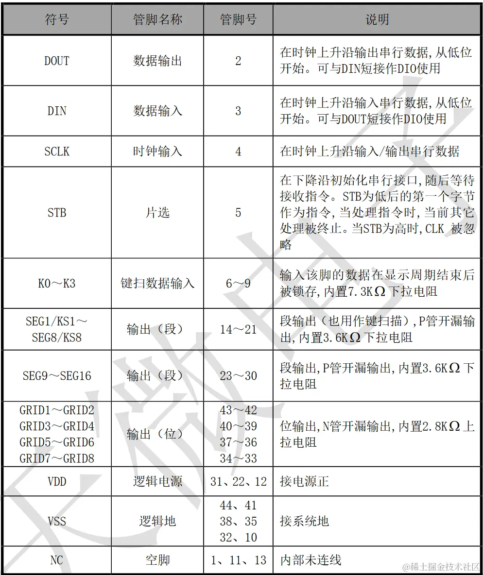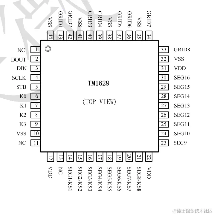 TM1629是带键盘扫描接口的LED(发光二极管显示器)驱动控制专用电路,内部集成有MCU 数字接口、数据锁存器、LED 高压驱动、键盘扫描等电路。