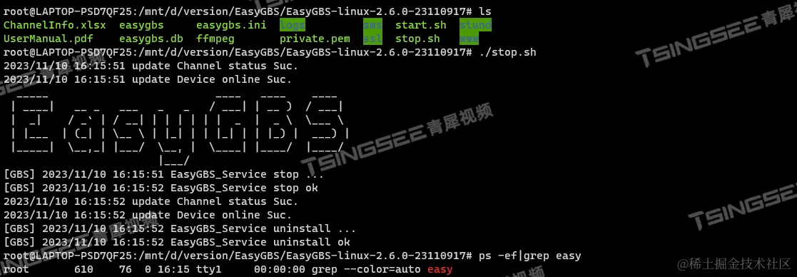 1、首先进入EasyGBS安装目录,执行stop.sh,完成后ps确认是否还有相关进程存留,以下状态即为卸载完成: