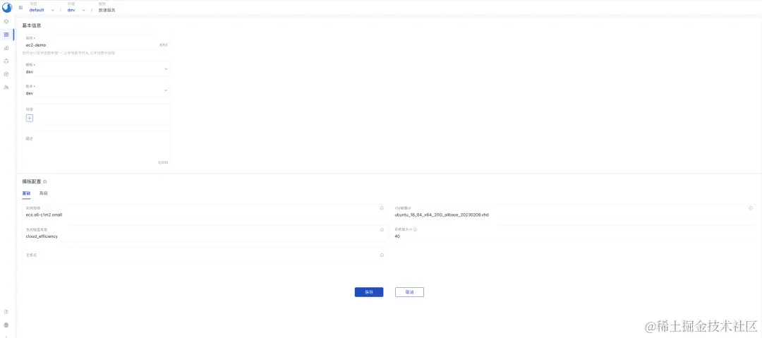 aliyun-ec2创建一个服务, 表单组和标签的渲染是根据上述模板中定义的变量注释自动生成的。