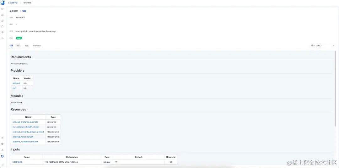 README.md文件是模板的描述。在使用此模板创建服务时,我们可以在模板详情页面查看该模板的具体功能参数及定义。这里我们可以使用工具 terraform-docs来生成模板的描述。