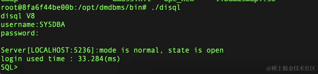 disql 在此目录下。执行之后,将显示当前版本,提示输入用户名/密码(数据库默认用户名/密码为 SYSDBA/SYSDBA001)