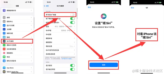 步骤3:打开【用“嘿 Siri”唤醒】选项,然后在弹出页面中点击【继续】,根据手机提示对手机说出“嘿,Siri”,手机成功识别您的声音后即代表设置成功。