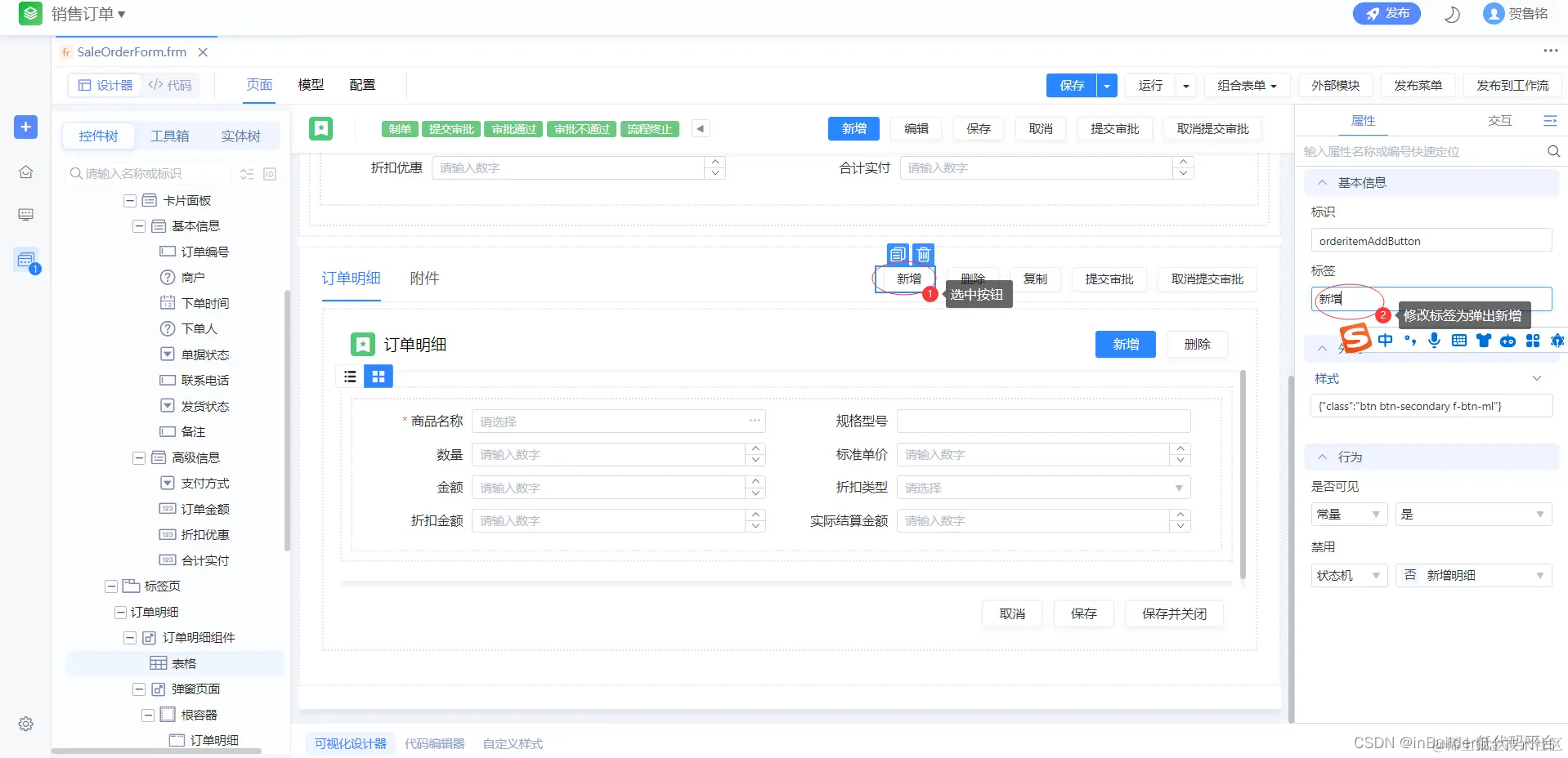 选中新增按钮,在右边属性栏修改为“弹出新增” 。