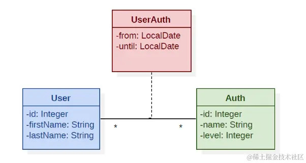 现在,想象一下,在应用程序的生产生命周期期间出现了一个新的需求:出于管理原因,客户需要将授权限定在特定时间段内(即有效期的开始和结束日期),如图 2.1 所示,将 User 和 Auth 之间的关系转变为 N 对 N。这种领域模型可以通过类似于表 2.1 的架构在关系型数据库管理系统(RDBMS)中支持,或者在面向图形的数据库管理系统中,如图 2.2 中的知识图所示。