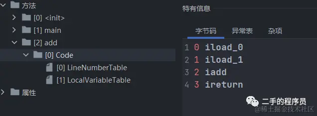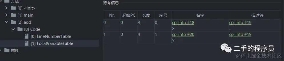 我们看到第0号位置是 x,第 1 号位置是 y,与源码是对的上的。后面我们实现参数传递的时候再说局部变量表里面的值。