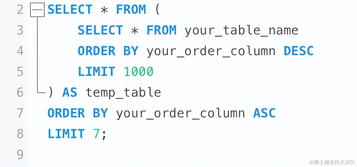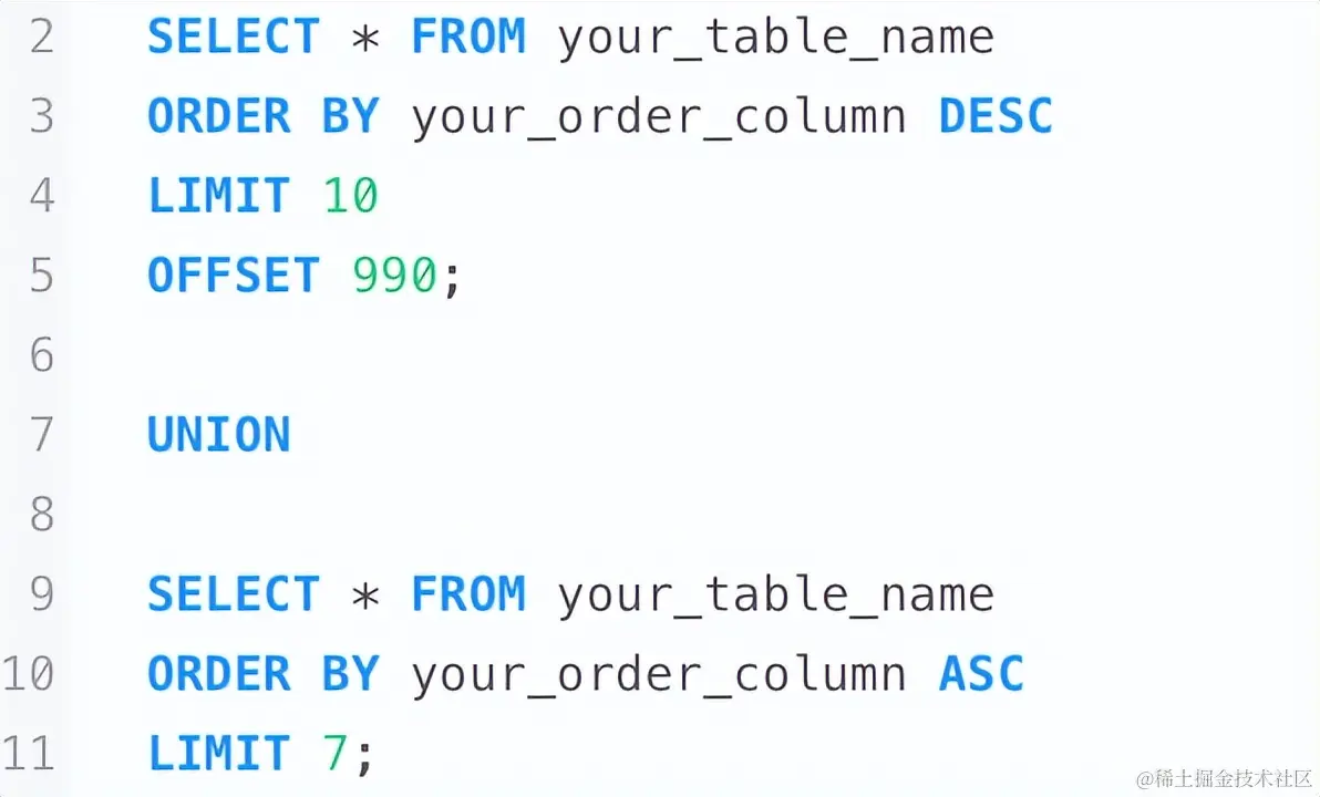 最后,我们可以考虑使用联合查询,先查询出后十条数据,然后再查询前7条。具体SQL语句如下:
