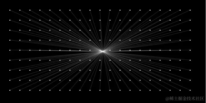 // 通过嵌套循环在二维平面内等距绘制一个小矩形,并与画布中心连线