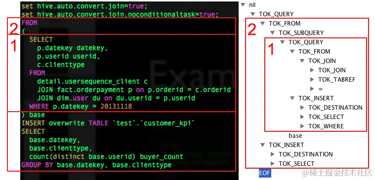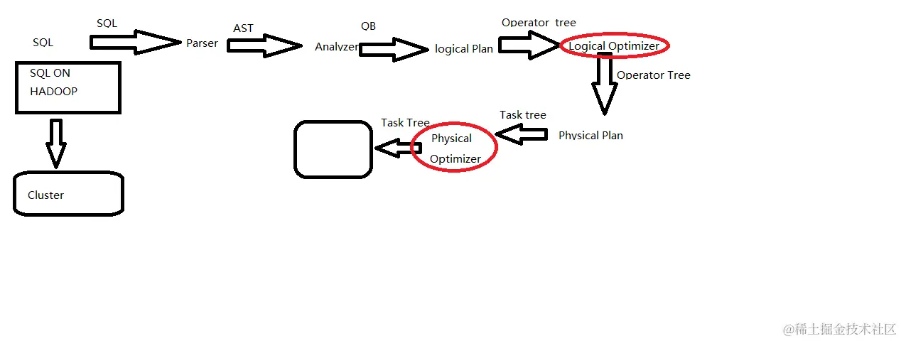 结论:经过以上的六步,普通的字符串sql被解析映射成了集群上的执行任务,最重要的两步是 逻辑执行计划优化和物理执行计划优化(图中红线圈画)