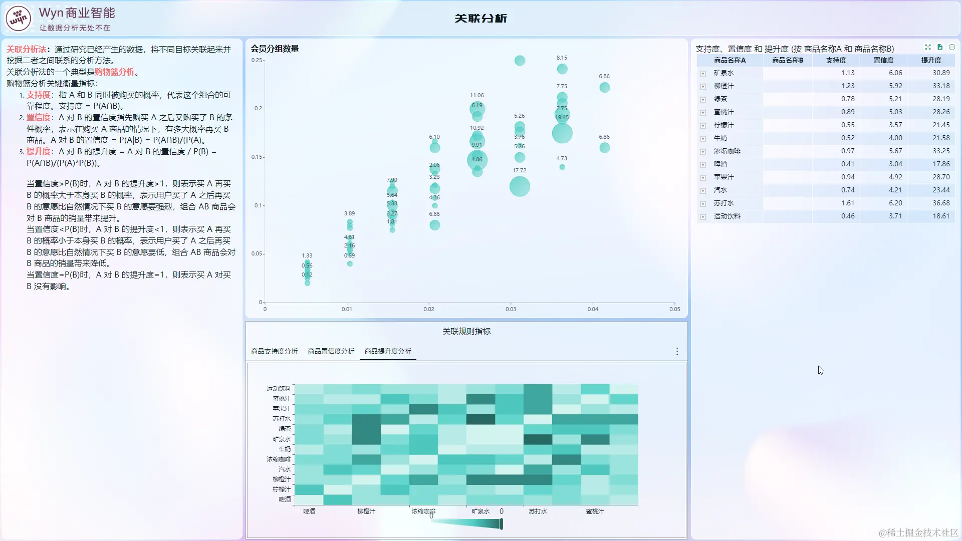 当置信度 >P(B) 时,A 对 B 的提升度 >1,则表示买 A 再买 B 的概率大于本身买 B 的概率,表示用户买了 A 之后再买 B 的意愿比自然情况下买 B 的意愿要强烈,组合 AB 商品会对 B 商品的销量带来提升。