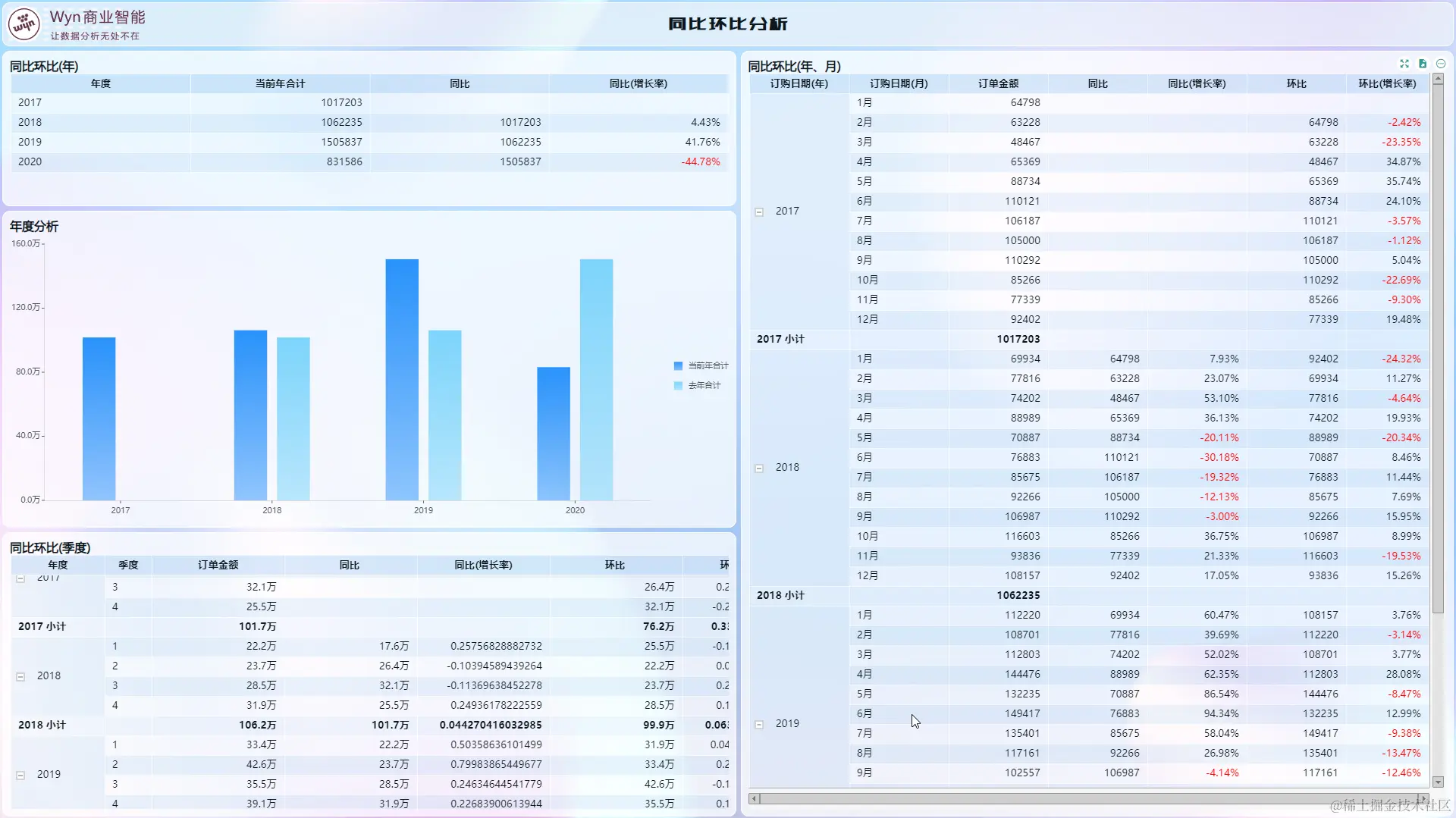 - 同比:与历史同时期比较,例如 2022 年3 月份与 2021 年 3 月份相比,叫同比。同比发展速度主要是为了消除季节变动的影响,用以说明本期发展水平与去年同期发展水平对比而达到的相对发展速度。常用于分析数据的长期趋势。